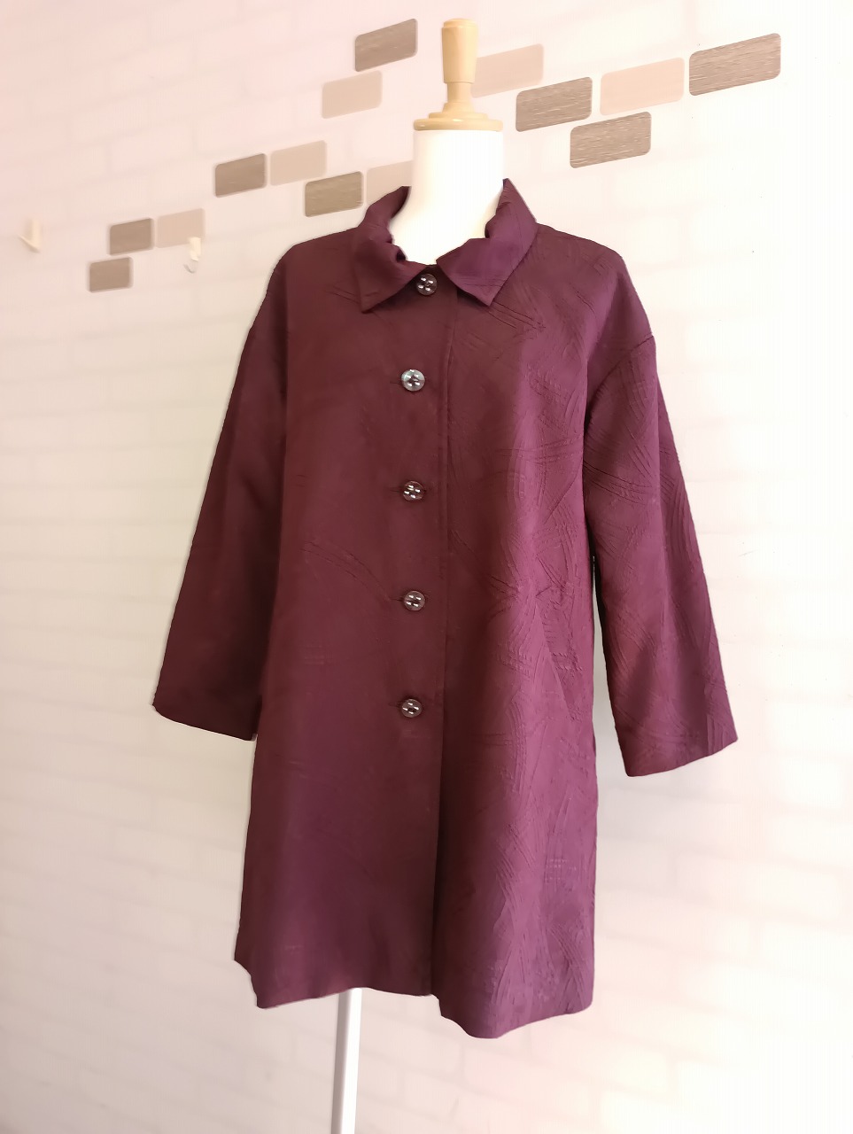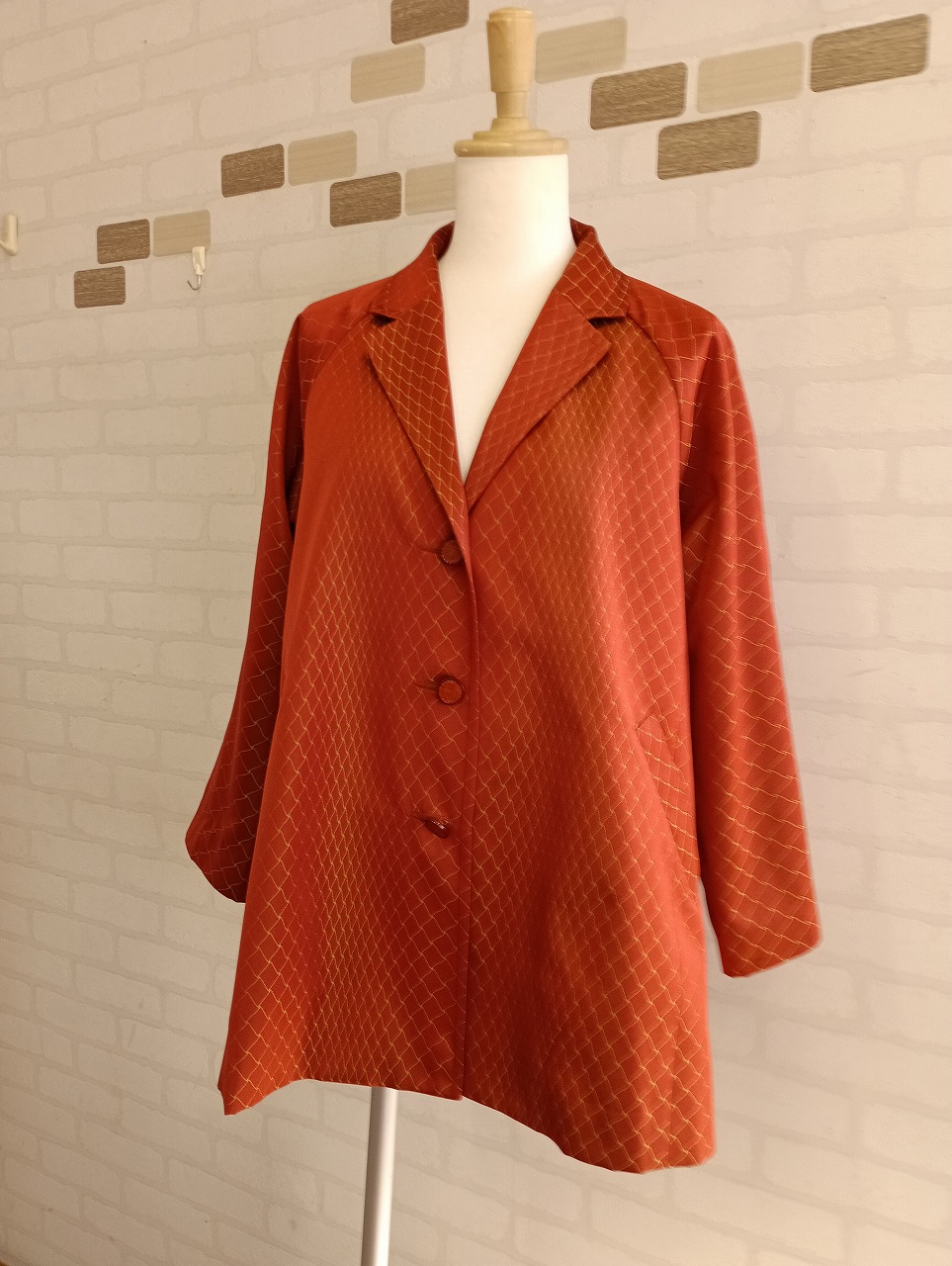 紺地に赤の柄の紬でテーラードスーツを仕立てました。