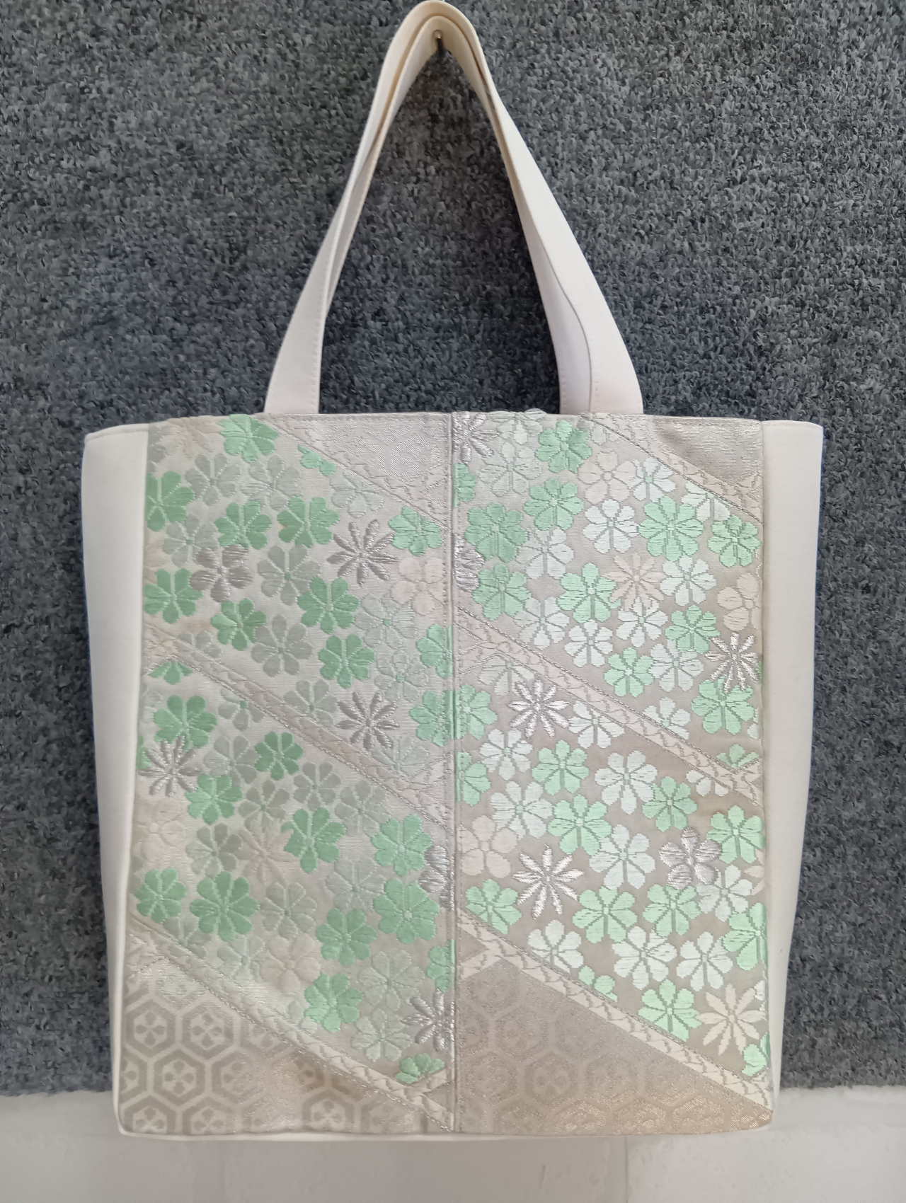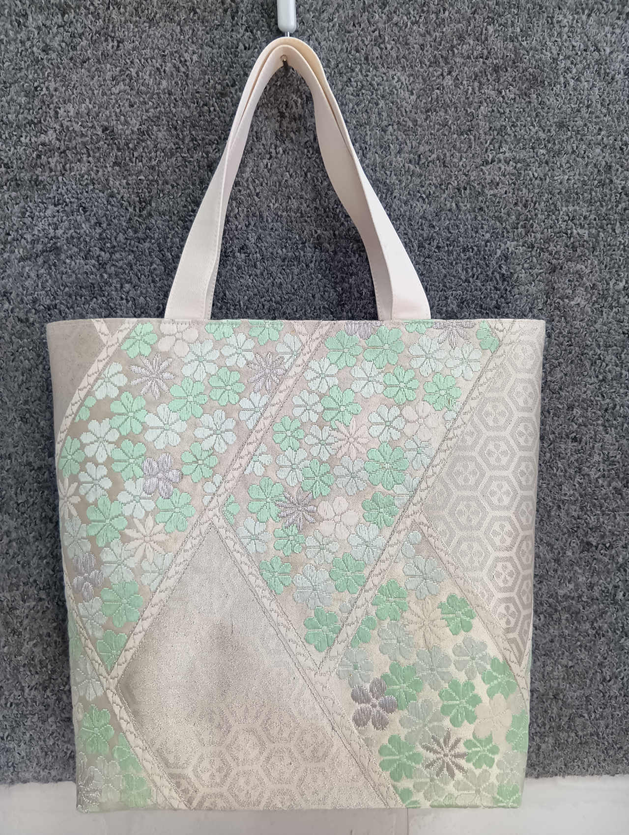淡い色味が優しい印象の花柄袋帯で作ったトートバッグです。