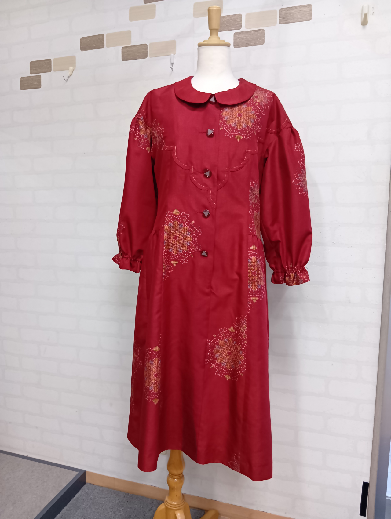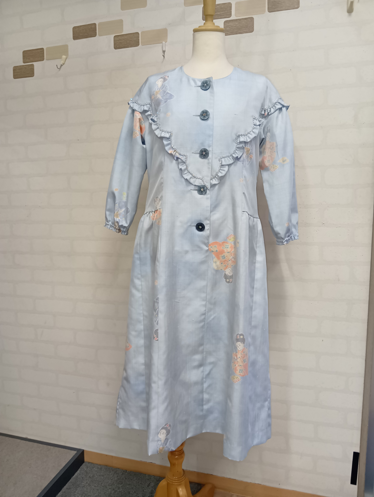 人形柄の紬をもちいて、スカラップフリルがポイントのワンピースを作りました。
