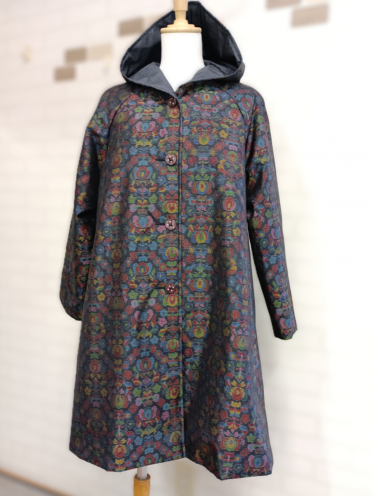 黒地に小花がらの大島で綿入りのフード付コートを作りました。